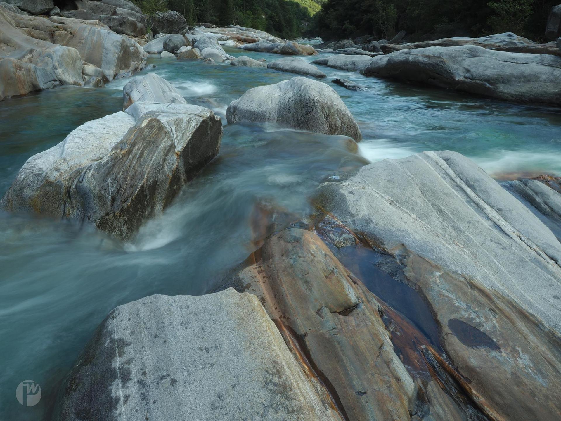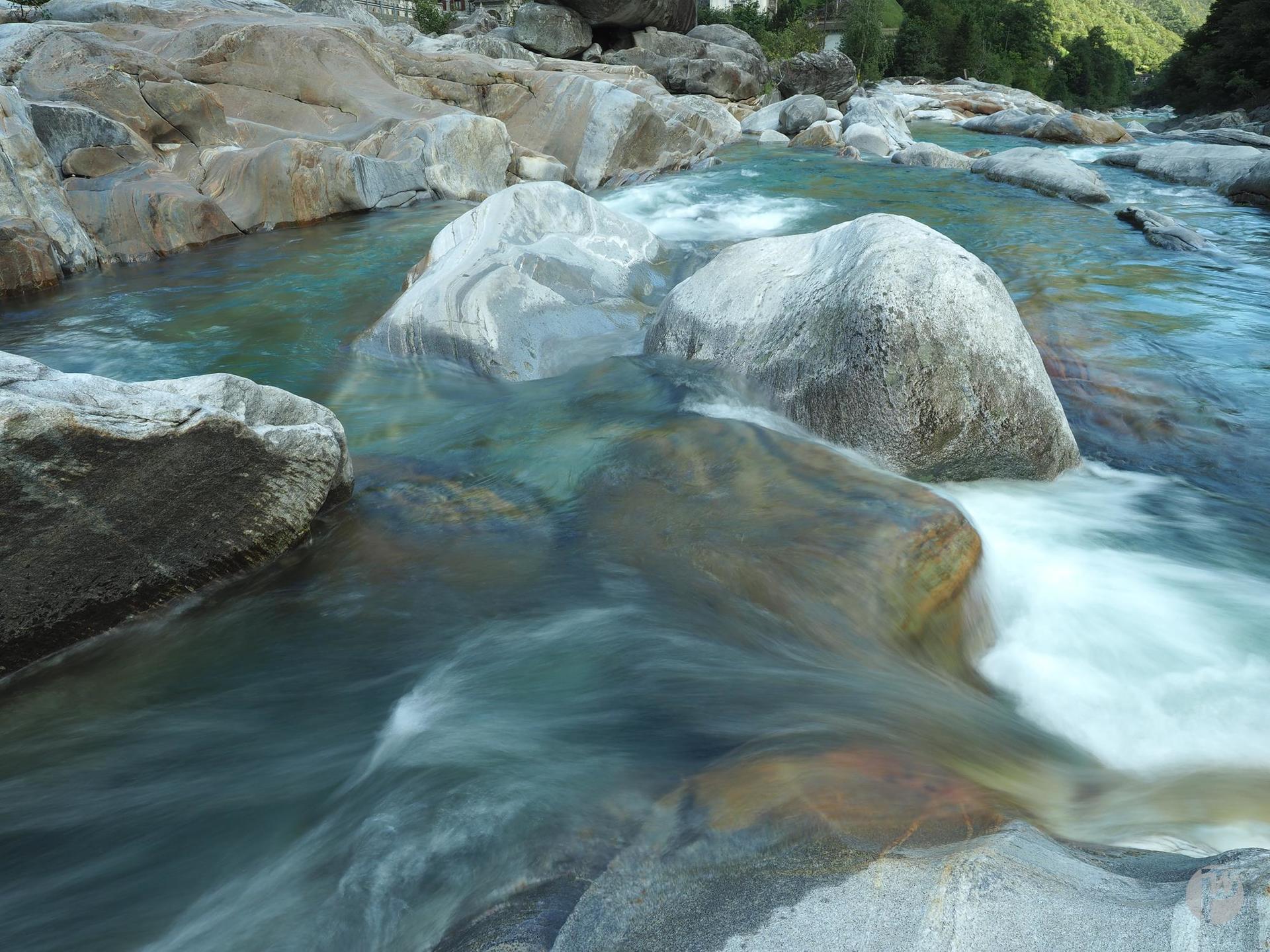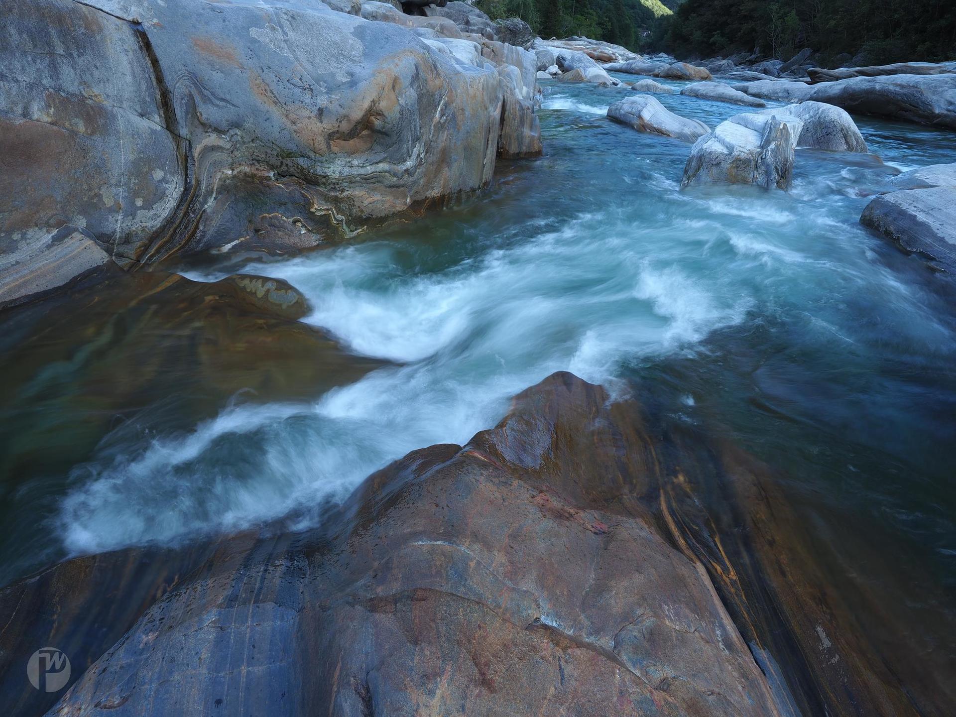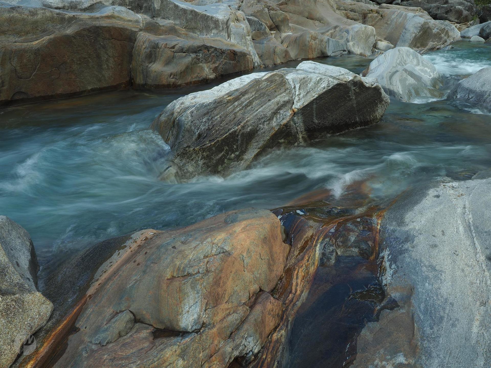Wunderschön bunte Felsen und je nach Wasserstand unterschiedliche Strömung kann man an der Versasca im Tessin sehen